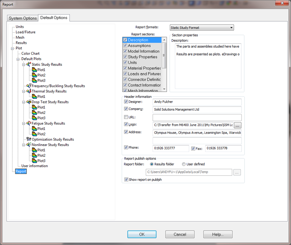 SOLIDWORKS Simulation has a report writer that generates great looking Word documents - complete with formatted tables, coloured result plots etc. However, did you know you can customise this? Recently I was with a customer who commented he had to keep putting his details (name, company etc) into the report and I realised he had not found out how to customise a standard one. It realliy is very easy and, when you have added your own details, logos, standard text, assumptions, etc, becomes a very useful document - with little effort. Make sure you add as much information as you can - then you won't ever need to repeat it. If you add too much - it is easier to delete than create!