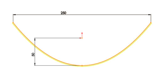 The basic shape I chose is shown below. This was conveniently created using the SOLIDWORKS ‘Parabola’ sketch entity. The reason for the shape is that parabolas have a special optical property: if they are made of material that reflects light, then light which travels parallel to the axis of symmetry of the parabola and strikes its concave side is reflected to its focus, regardless of where on the parabola the reflection occurs. In other words, all the solar energy is focussed at a single point.