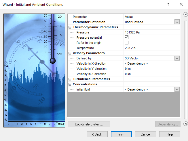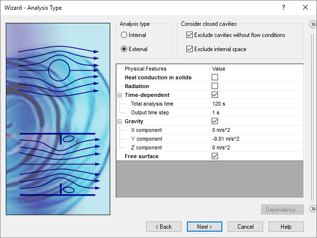 I thought that speed should in knots, so we can easily set that up. Next we need to set the free surface tag. Doing this does mean that we have to make the analysis time dependent. Gravity is optional, but was a must for this study. Fluids of Air and Water were selected. The rest was fairly standard until the final page of the wizard.