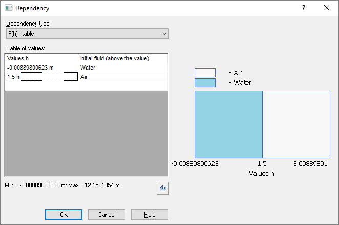 In the Initial and Ambient Conditions we need to set up a dependency for the main flow and the initial fluid. The Initial Fluid can be set as a function of height in the simulation to give an initial surface level. Next the velocity was set up. Again this was set as varying with time as follows: