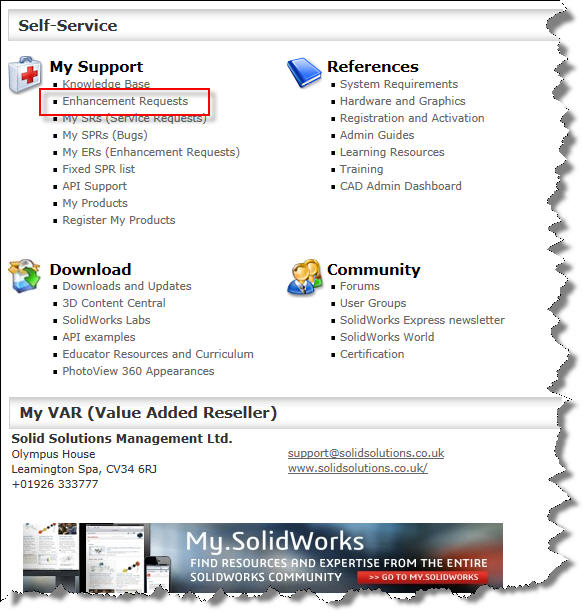 SOLIDWORKS Customer Portal. If you have never logged in and registered- do so!! It is a great resource that forms part of the subscription package. As well as the Enhancement Request facility, you can also download updates from here, and search an extensive Knowledge Base of tips, tricks and solutions.