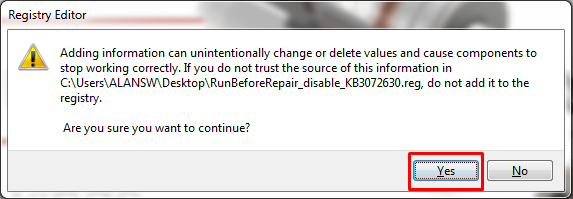 3. Double click on the file “RunBeforeRepair_disable_KB3072630.reg"