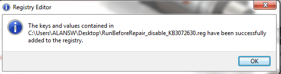 “RunBeforeRepair_disable_KB3072630.reg to add the registry entries to your system