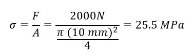 σ=F/A=2000N/((π (10 mm)^2)/4)=25.5 MPa