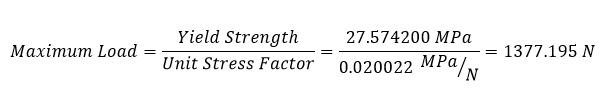Maximum Load=(Yield Strength)/(Unit Stress Factor)=(27.574200 MPa)/(0.020022 MPa⁄N)=1377.195 N