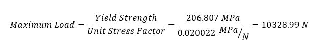 Maximum Load=(Yield Strength)/(Unit Stress Factor)=(206.807 MPa)/(0.020022 MPa⁄N)=10328.99 N