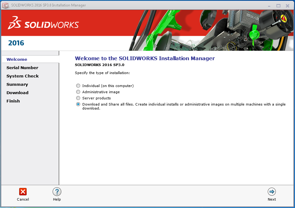 Once you run the downloaded Installation Manager, you will be presented with this screen- select the last option which will either say "Download Only" (for SOLIDWORKS 2015 and prior) or "Download and Share all Files" (for SOLIDWORKS 2016).