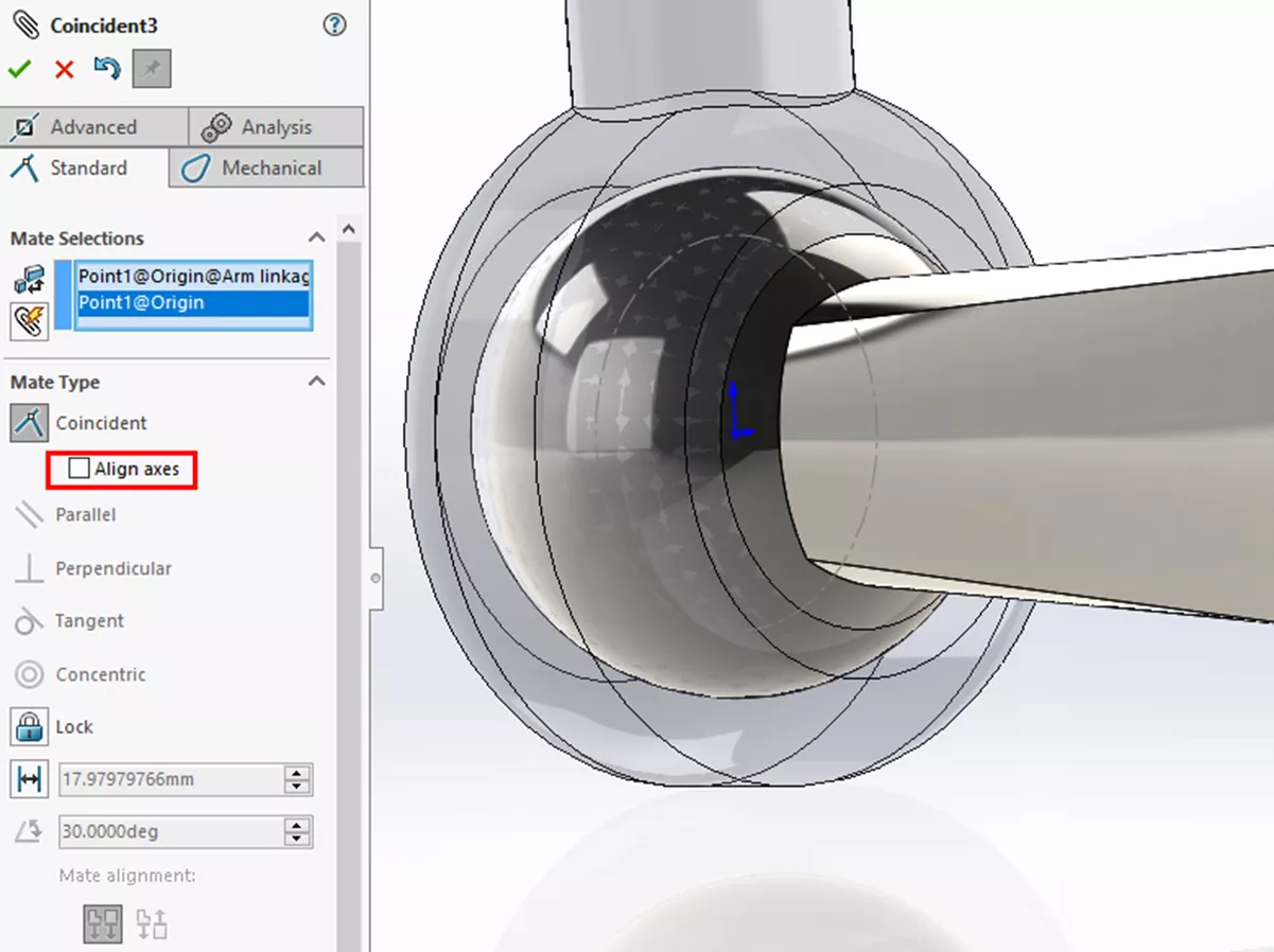 The best practice to mate a ball to a socket, is to find a way to mate the centre of the socket to the centre of the ball coincidently. So, how exactly do we achieve this? The simplest method is to have good design intent and design the ball and socket to be centred around the origin. This makes life simple down the line, as you can just add a coincident relation between the two origin points. It is important to untick ‘Align axes’ checkbox when mating the origin points, otherwise there will be no rotation.