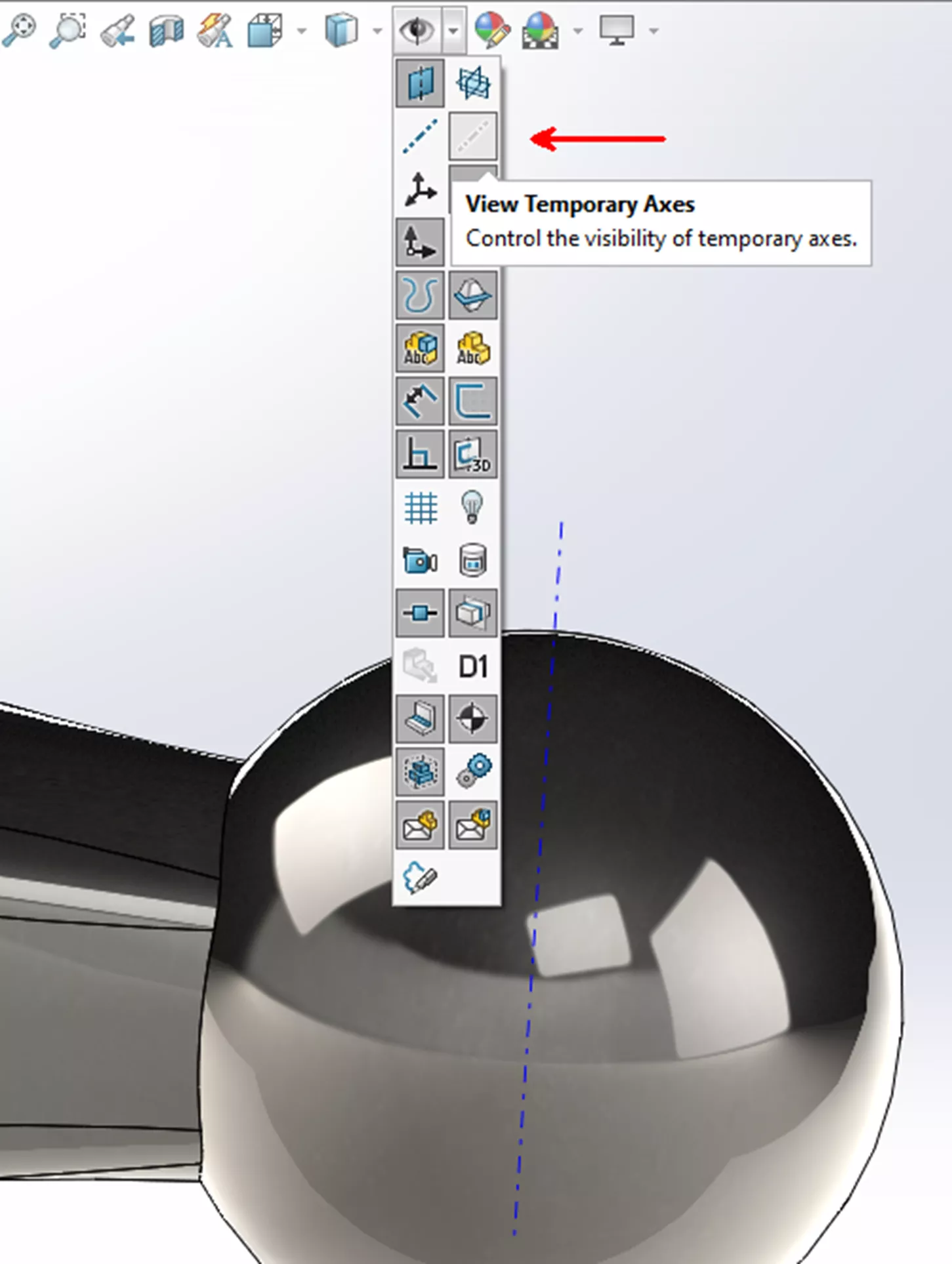 We can make use of temporary axes for this, as they populate at the centre of every cylindrical and conical face. To make the temporary axes visible, simply select the option from the heads-up view toolbar. Together the temporary axis and a perpendicular plane can be used as references for a new plane that intersects through the centre of the ball.